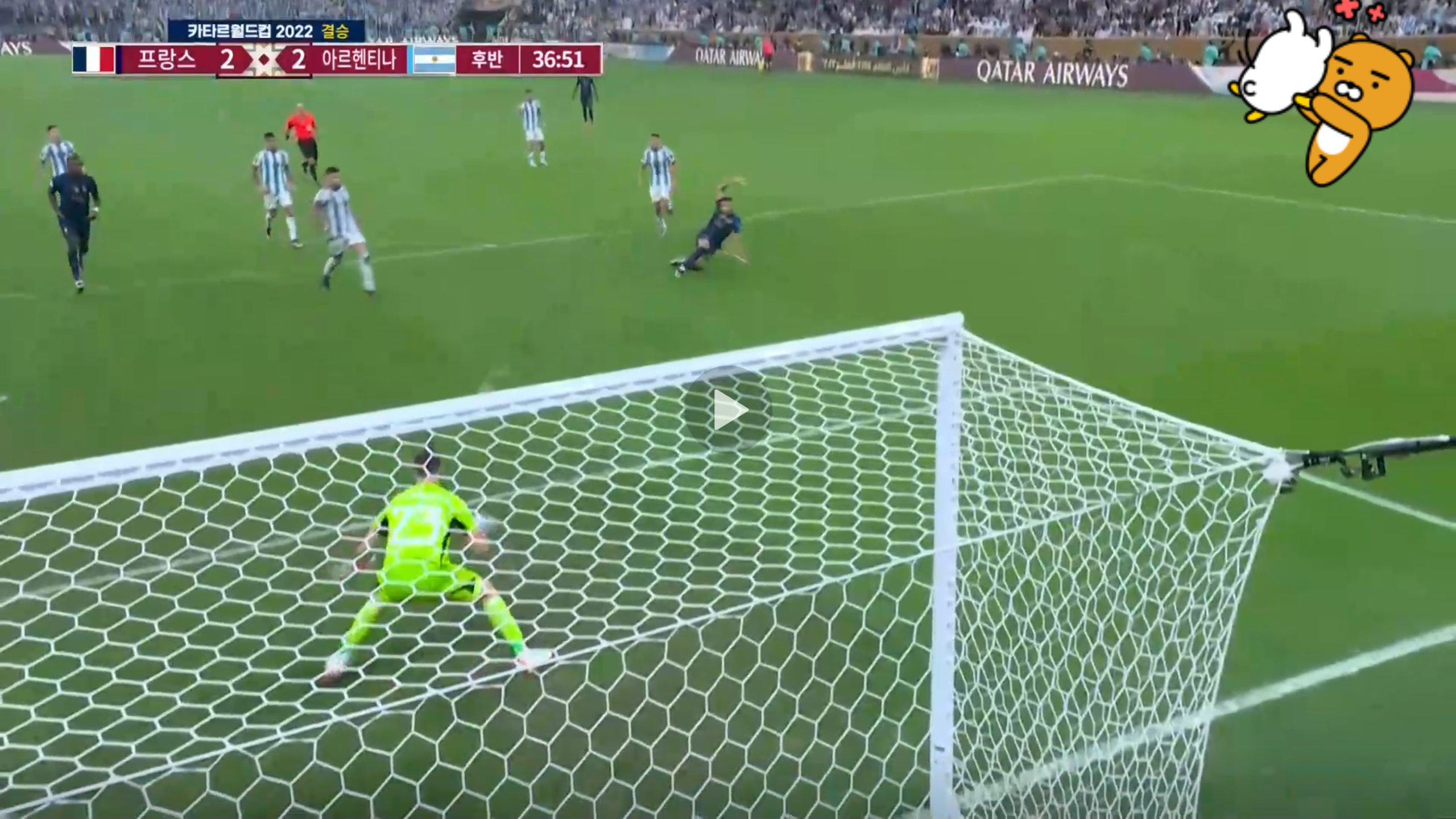 페널티킥 성공의 여운이 채 가시기도 전, 36분경 음바페가 페널티박스 안에서 아르헨티나의 골대 오른쪽구석을 갈라버리는 오른발 발리슛을 날려 동점을 만들어 버렸어요. 온몸에 소름이 돋는 골이었습니다. 전반전과 전혀 다른 양상으로 몰아부치기 시작하는 프랑스... 순식간에 동점을 허용하고 우왕좌왕하는 아르헨티나...